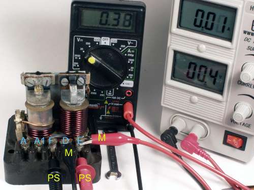 Ich würde den Test beginnen, indem ich die Spannung erhöhe, um zu sehen, ob die Spule auf der rechten Seite funktioniert. Die Bewegung dieser Spule ist viel einfacher zu sehen als die der Spule auf der linken Seite. Wenn Sie möchten, können Sie das Stromkabel an der F-Klemme abklemmen und die Stromversorgung auf 18 Volt einstellen. Klopfen Sie mit dem Stromkabel auf die F- (oder D-) Klemme. Wenn die Spule funktioniert, hören Sie ein hörbares Klopf- oder Klickgeräusch – wie bei einer Telegrafentaste. Während Sie dies tun, sollten Sie die Spannung so hoch einstellen, dass die Kontakte geschlossen bleiben, und das Magnetfeld auf der Oberseite jeder Spule überprüfen. Ein kleiner Schraubendreher, der auf die Oberseite der Spule gelegt wird, wird von der Spule angezogen. Die rechte Spule wird stärker angezogen als die linke. Sie sollten auch die Bewegung der Kontakte auf der rechten Spule untersuchen. Erhöhen Sie die Spannung langsam, und die Kontakte beginnen sich zu schließen. Wenn sie sich vollständig geschlossen haben, verringern Sie die Spannung. Die Kontakte öffnen sich. Es sollte ein Unterschied zwischen der Öffnungs- und der Schließspannung bestehen. Diese Ausschaltspannungen müssen Sie einstellen. Laut Werkstatthandbuch sollten die korrekten Werte zwischen 8,5 Volt und 11,0 Volt liegen. Allerdings wird im Werkstatthandbuch zuerst die Einstellung der Leerlaufspannung beschrieben, sodass ich die Einstellung der Abschaltspannung zuletzt vornehme.