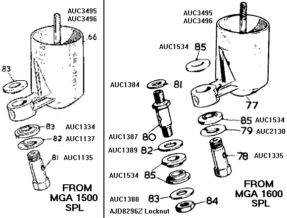 In der werkseitigen Ersatzteilliste für MGA wird die hier als „Standard” bezeichnete „starre” Halterung nicht erwähnt. Die „Alt 1”-Konfiguration wurde bei den meisten MGA 1500 eingebaut, während „Alt 2” bei allen späteren MGA verwendet wurde. Der Umschaltpunkt könnte bei der Produktion im Januar 1959 liegen. Die starre Halterung soll bei einigen der in Australien montierten CKD-Fahrzeugen zu finden sein. Dies kann entweder ein Originalteil sein oder nachträglich eingebaut worden sein (was noch nicht geklärt ist).