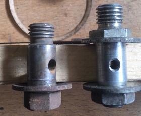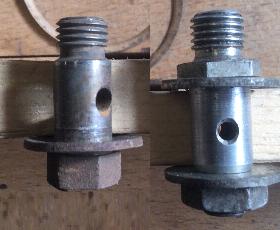 Hier sehen Sie Bilder der beiden unterschiedlichen Hohlschrauben nebeneinander zum Vergleich. Das Foto links zeigt sie mit den Hohlschrauben auf gleicher Höhe. Das Foto rechts wurde geteilt, wobei die Schraube im Verhältnis zum Bolzen höher angehoben wurde, um die oberen Befestigungsschultern auf die gleiche Höhe zu bringen. So werden sie im Auto eingebaut, wobei für die 1500er- und 1600er-Modelle die gleichen Drosselklappengehäuse verwendet werden. Hier wird der Unterschied in der Montagehöhe der Schwimmerkammern deutlicher. Dieser Unterschied in der Höhe der Kraftstoffkammer ist wahrscheinlich der Hauptgrund, warum die 1500er- und 1600er-Motoren unterschiedliche Kraftstoffmessnadeln haben.