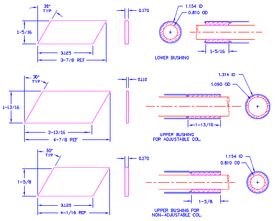 Die obere Buchse (für die verstellbare Lenksäule) sollte 0,110″ dick sein, jetzt ist sie 0,125″ dick. Die 0,015″ mehr Radius reichen aus, um ein Verklemmen der Lenksäule nahezu unmöglich zu machen und die Lenkung mit zwei Händen am Lenkrad sehr schwergängig zu machen, sodass ein Fahren auf der Straße unmöglich ist.