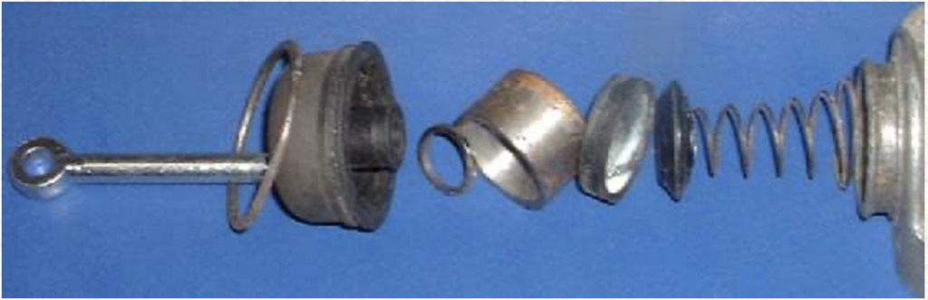 Alle Hydraulikzylinder im MGA (außer den Bremssätteln der Scheibenbremsen) haben interne Teile, die den oben gezeigten ähnlich sind. Es gibt eine leichte Druckfeder, einen Kunststoff-„Einfüllstutzen“, eine Gummidichtungsschale und einen Stahlkolben. Der Kolben ist lang genug, um gerade in der Zylinderbohrung geführt zu werden. Der Kolben und die Dichtungsschale haben aufeinander abgestimmte flache Flächen. Der „Einfüllstutzen“ ist ein Kunststoffknopf mit abgeschrägten Kanten, der in die Gummischale passt. Dieser dient dazu, die Schale flach in Kontakt mit dem Kolben zu halten. Er drückt auch auf die Innenseite der Gummilippe des Bechers, um die Lippe in Zeiten mit wenig oder gar keinem Hydraulikdruck in Kontakt mit der Zylinderwand zu halten. Hydraulikflüssigkeit, die unter hohem Druck steht, drückt gegen die Gummischale und schiebt den Kolben mit großer Kraft vorwärts. Wenn der Hydraulikdruck nachlässt, wird der Kolben durch eine externe mechanische Belastung zurück in die Zylinderbohrung gedrückt.