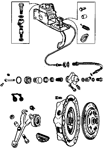 Eines der wichtigsten Merkmale dabei ist, dass die leichte Feder im Inneren des Nehmerzylinders den Zug der Arbeitsteile in engem Kontakt hält. Zwischen der Dichtungsmanschette, dem Kolben, der Stößelstange, dem Ausrückarm, dem Ausrücklager und der Eingangsdruckplatte am Kupplungsdeckel besteht kein Spiel oder Spiel. Dieser Mechanismus ist daher selbsteinstellend, um den Verschleiß der Kupplung und die allmähliche Veränderung der Position der Betriebsteile auszugleichen. Das mit Graphit beschichtete Ausrücklager läuft in sanftem, engem Kontakt mit der Ausrückdruckplatte. Graphit auf einer glatten Stahloberfläche ist selbstschmierend, so dass es lange halten wird, bevor es abgenutzt ist (vielleicht 80.000 Meilen oder mehr).